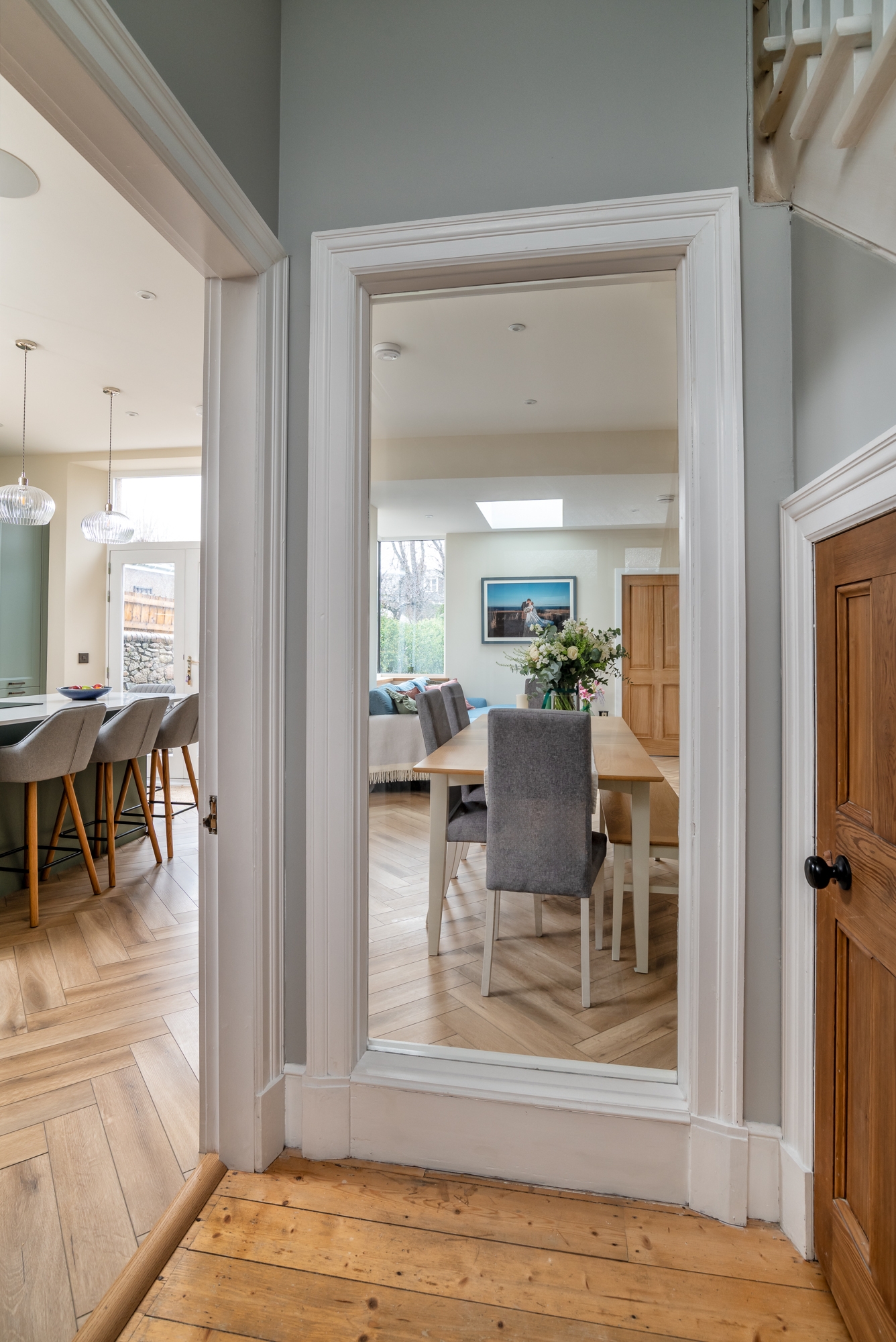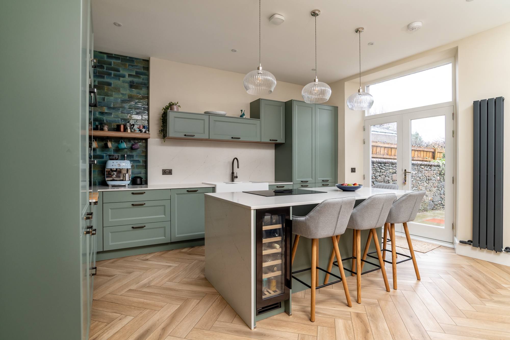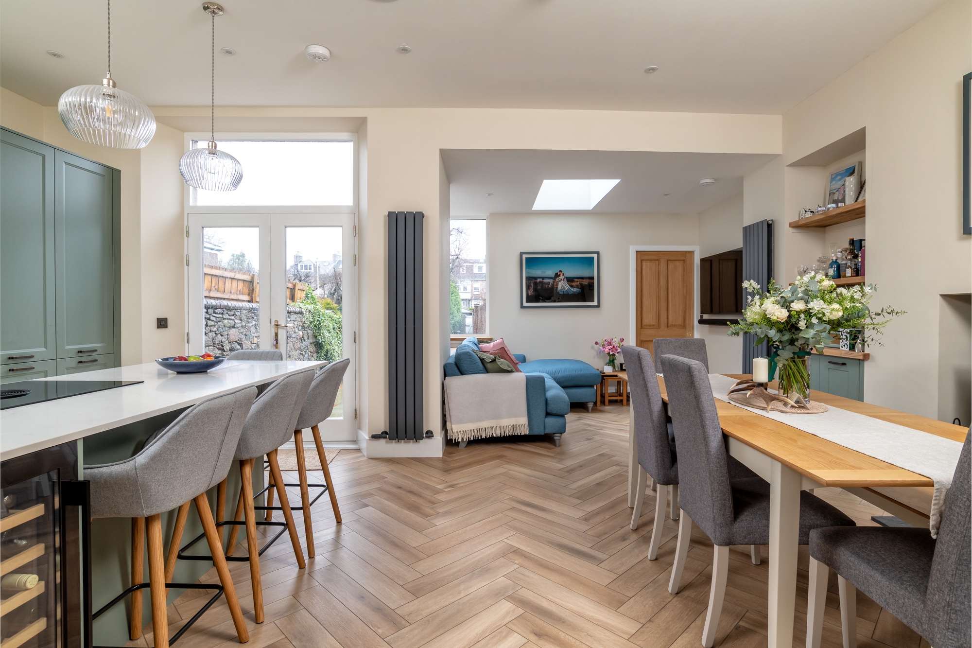 A new kitchen, with central island, was fitted in what was the existing Dining space, with the wall removed to allow for the Kitchen and Dining space to function as a modern open plan space.