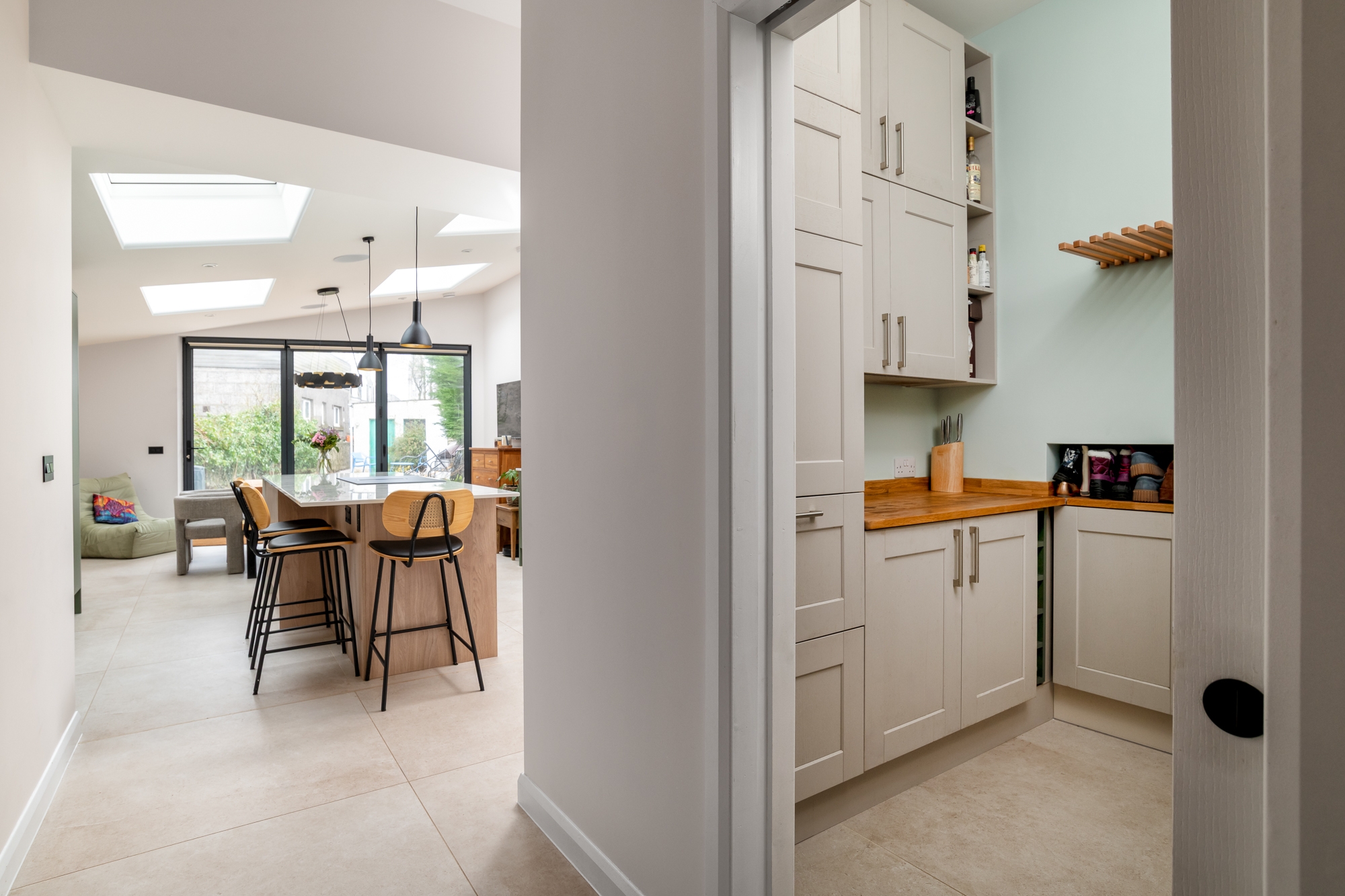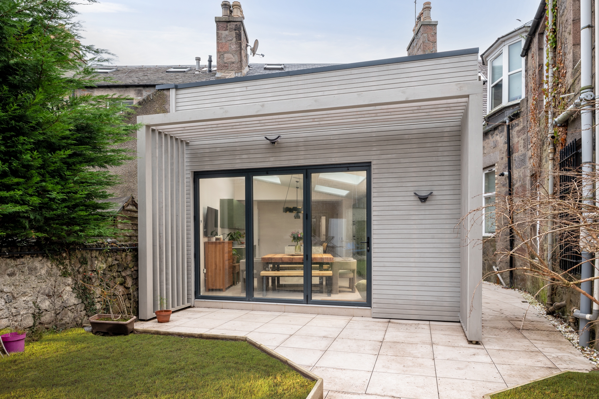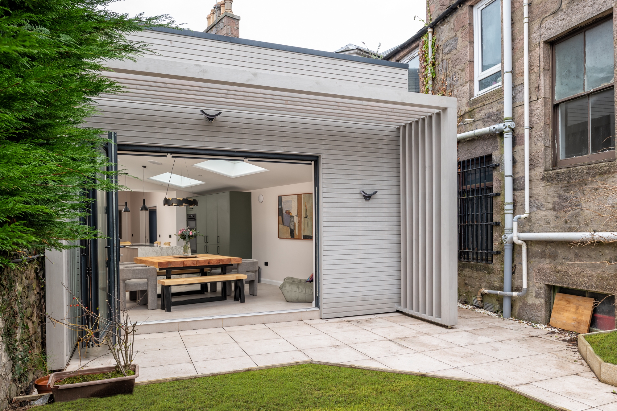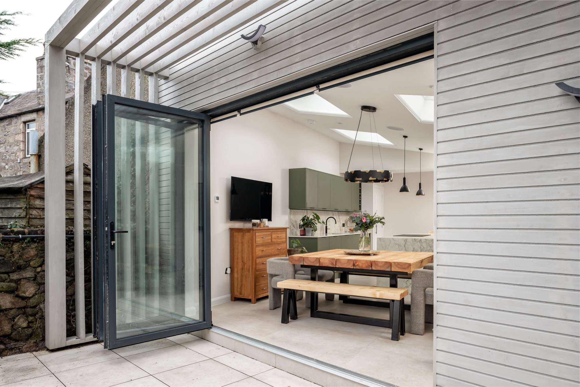 Solid walls to the neighbouring sides create privacy, while natural daylight is brought into the space with new rooflights. Externally, a pergola structure was formed to provide an external seating area. Painted timber, provides a tactile surface, providing the gable of the extension with a modern aesthetic.