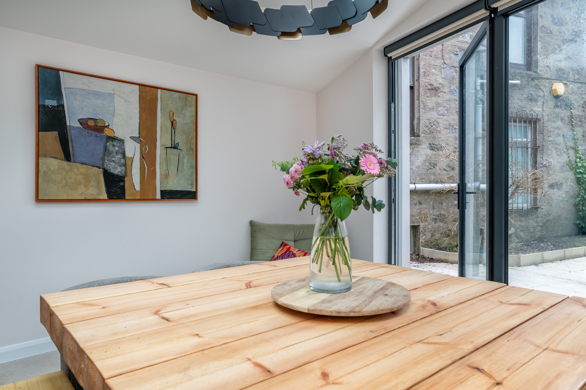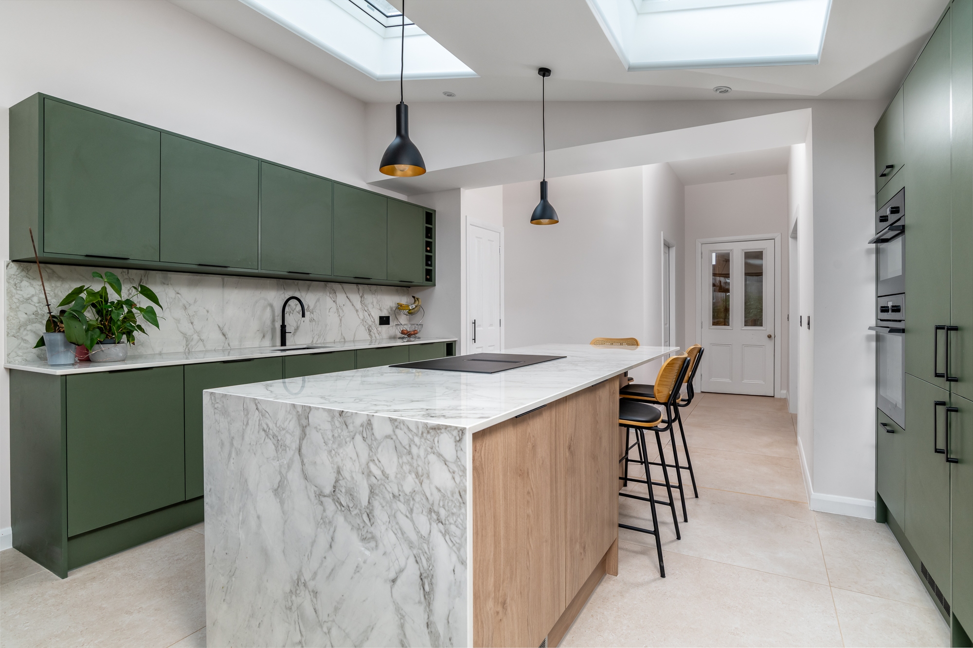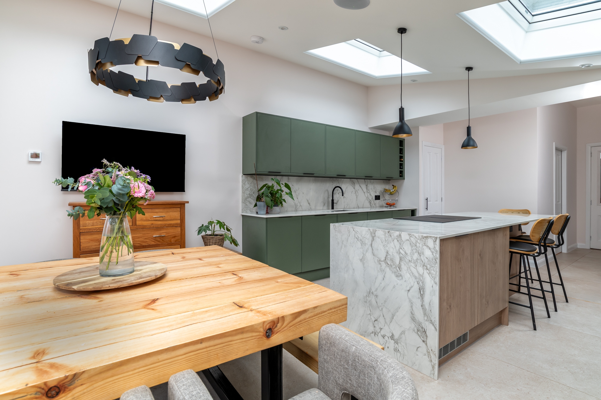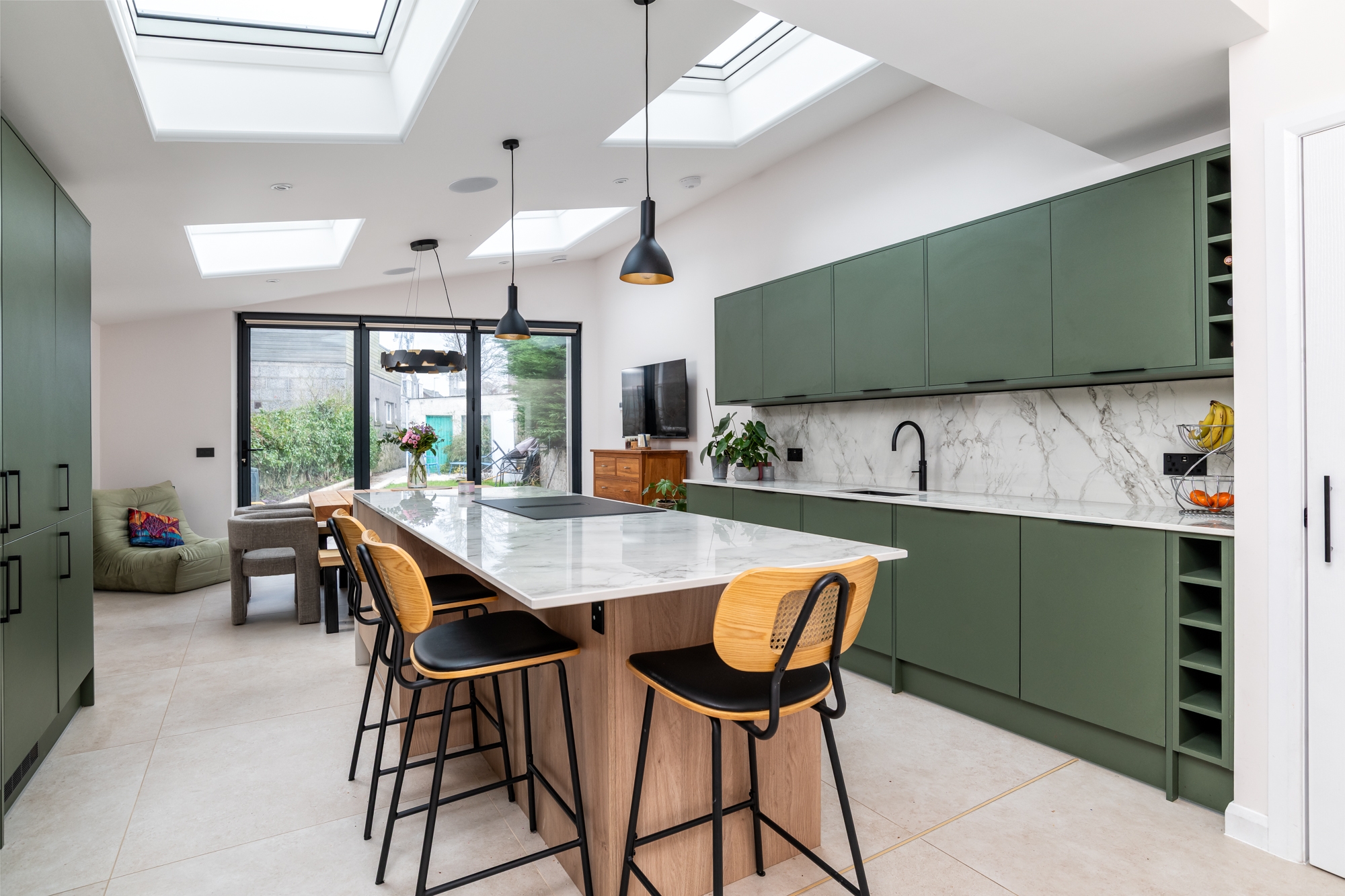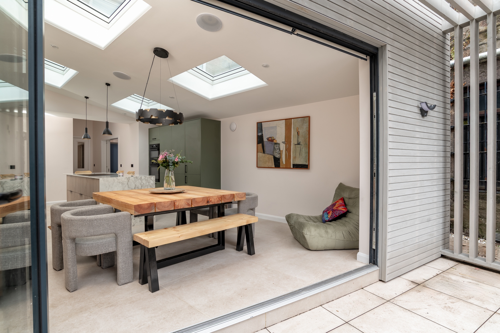 Solid walls to the neighbouring sides create privacy, while natural daylight is brought into the space with new rooflights. Externally, a pergola structure was formed to provide an external seating area. Painted timber, provides a tactile surface, providing the gable of the extension with a modern aesthetic.